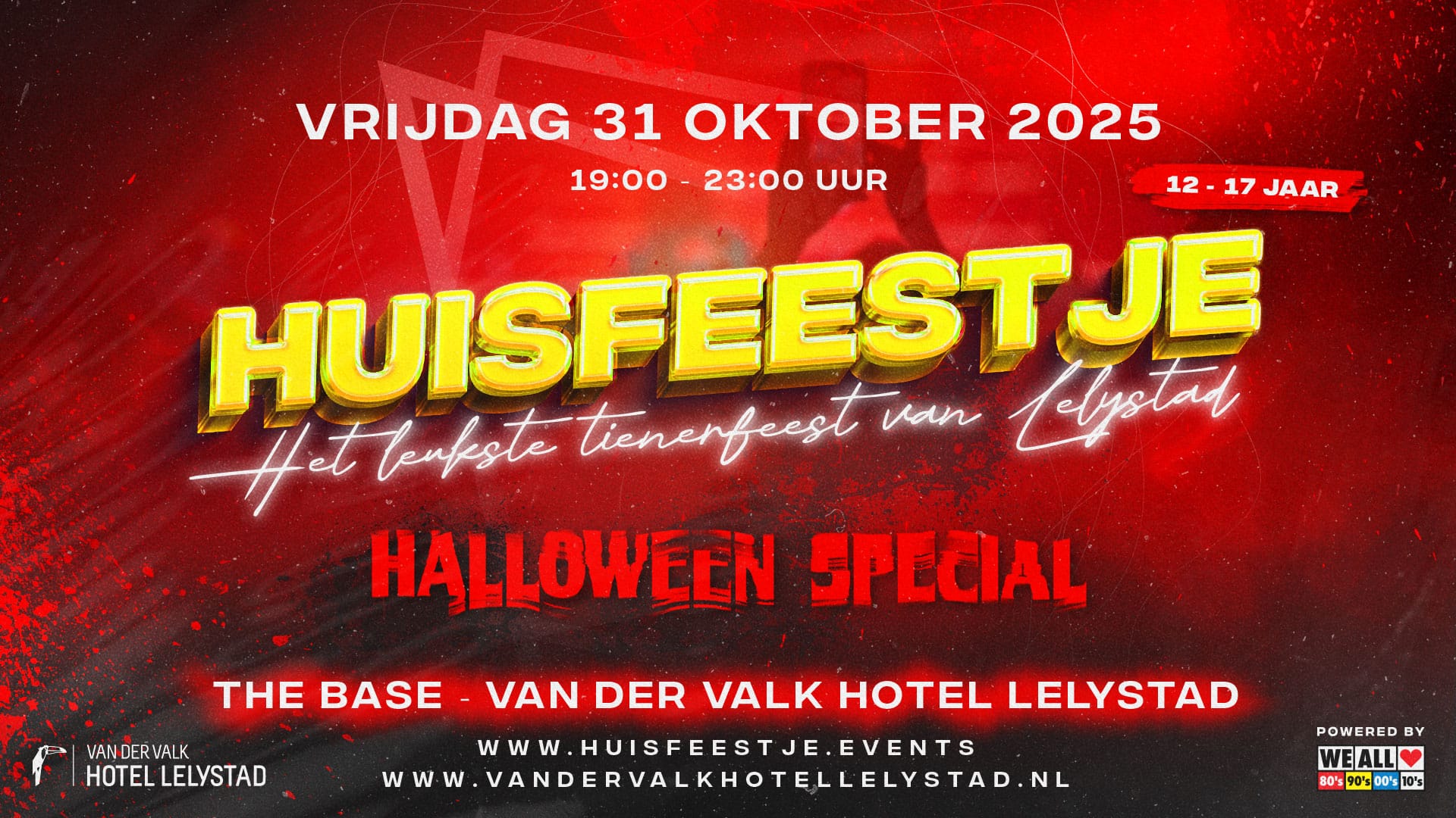 HUISFEESTJE is een evenement dat speciaal is ontworpen voor jongeren van 12 tot en met 17 jaar oud. Roxy deed het nog met 2 maar het huisfeestje bij Van der Valk is er voor iedereen die een toffe avond wil beleven. Op vrijdag 31 oktober is Huisfeestje terug met een speciale Halloween editie. Deze avond gaat het los en kunnen jullie een knallend feest ervaren in de mooiste discotheek The Base bij Van der Valk Hotel Lelystad. Verkleden is niet verplicht maar mag natuurlijk wel. Met dik geluid, een vette lichtshow en de beste DJ’s en MC knallen alle hitjes uit de speakers. Van Roxy Dekker tot Rihanna en van Antoon tot de Katy Perry. En wie weet komen de Bankzitters ook nog voorbij. Een feest waar jongeren zich volledig kunnen onderdompelen in muziek en dans. Of je nu houdt van elektronische dansmuziek, hip-hop, pop, hollandstalig of een ander genre, er is voor elk wat wils. De DJ’s en MC nemen jullie mee op reis langs de dikste partyklappers. Ze zullen jullie erbij betrekken om er een onvergetelijke avond van te maken waarbij de sfeer belangrijk is. Speciaal voor deze editie wordt de decoratie in The Base extra griezelig.