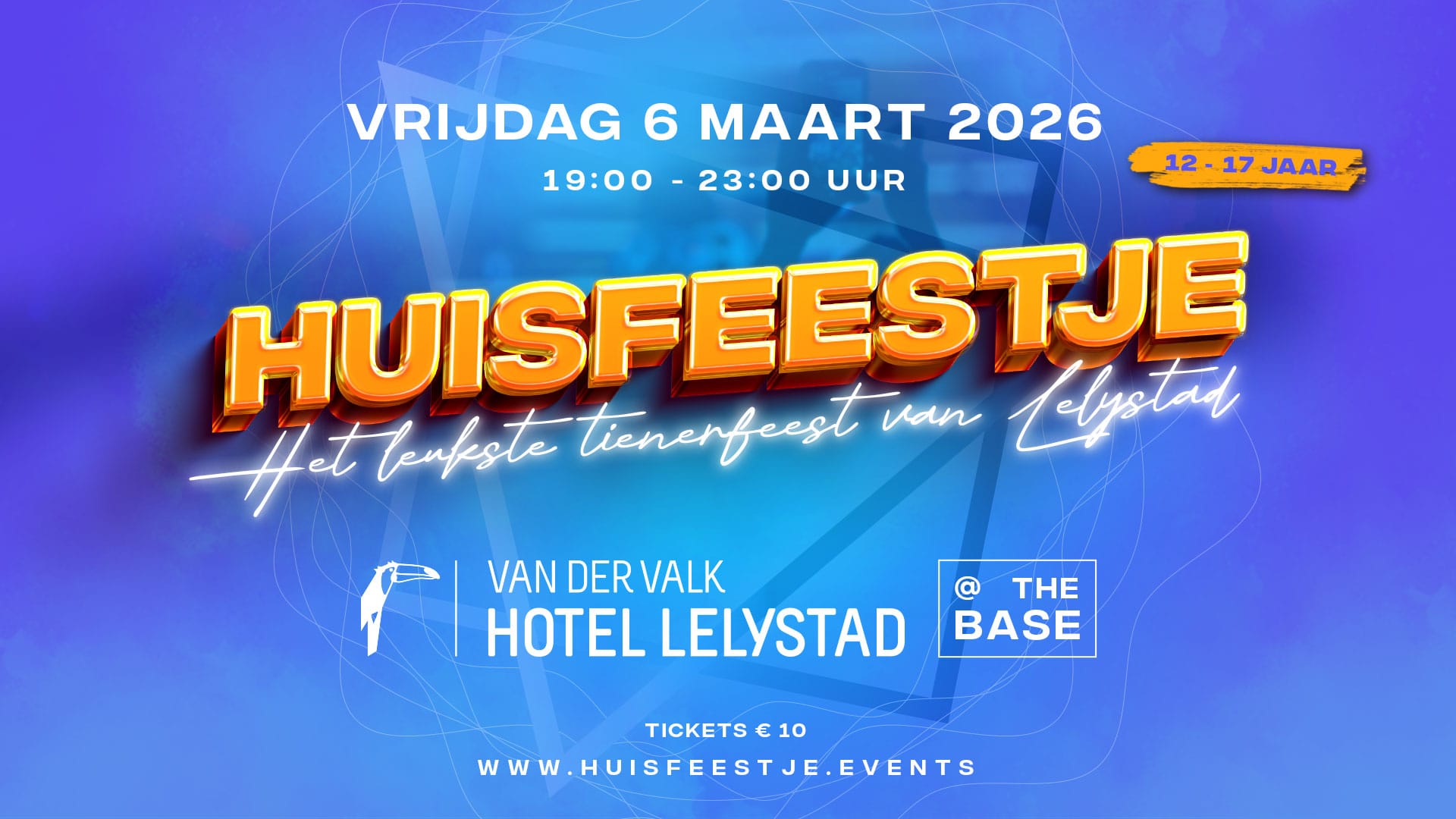 HUISFEESTJE is hét evenement voor jongeren van 12 t/m 17 jaar die zin hebben in een avond vol energie, muziek en gezelligheid. Geen gedoe, geen stress, gewoon met je vrienden losgaan op de beste tracks van het moment. Op vrijdag 6 maart 2026 is het weer zover: HUISFEESTJE keert terug naar The Base in Van der Valk Hotel Lelystad!